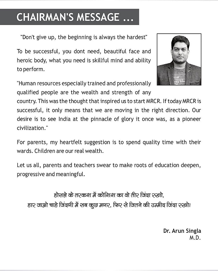 "Human resources especially trained and professionally qualified people are the wealth and strength of any country. This was the thought that inspired us to start MRCR. If today MRCR is successful, it only means that we are moving in the right direction. Our desire is to see India at the pinnacle of glory it once was, as a pioneer civilization."